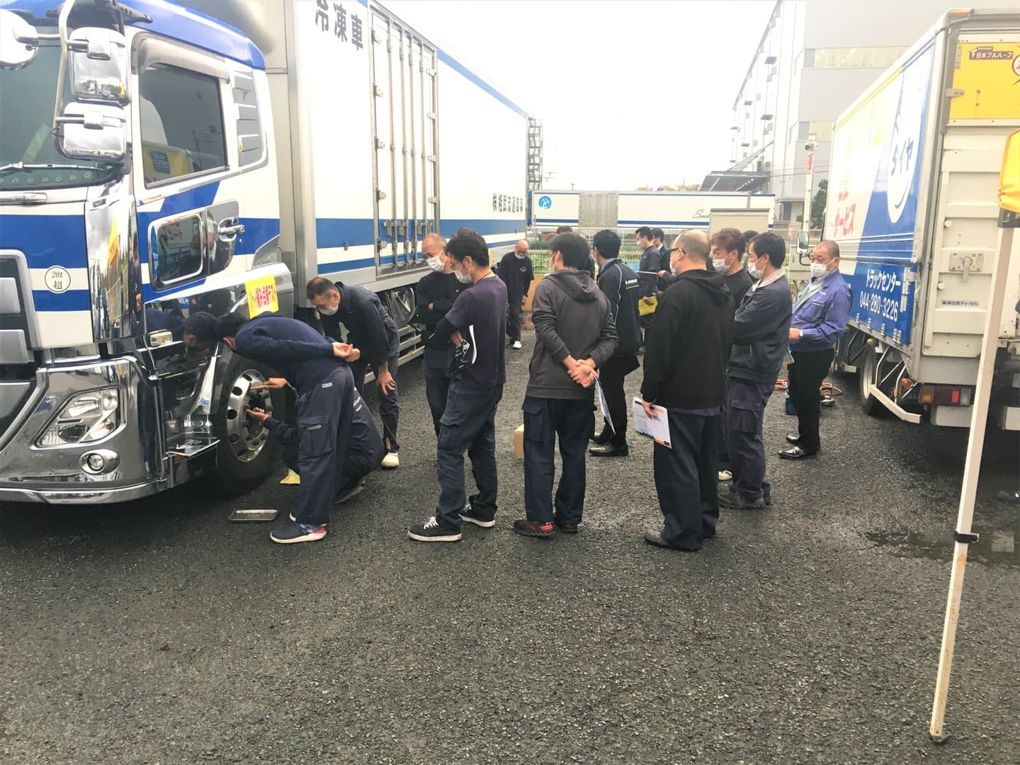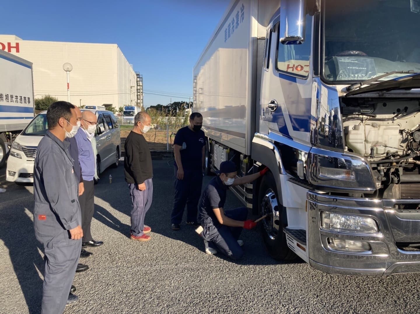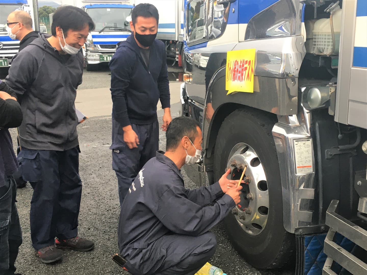 | 2022-11-26 | タイヤメーカー様にご協力頂き、タイヤ日常点検講習会を実施しました。 ナットの緩みや空気圧減圧状態などを再現して頂きました。参加者が見て触れて点検確認することが出来、良い経験になりました。タイヤメーカー様、ご協力ありがとうございました!