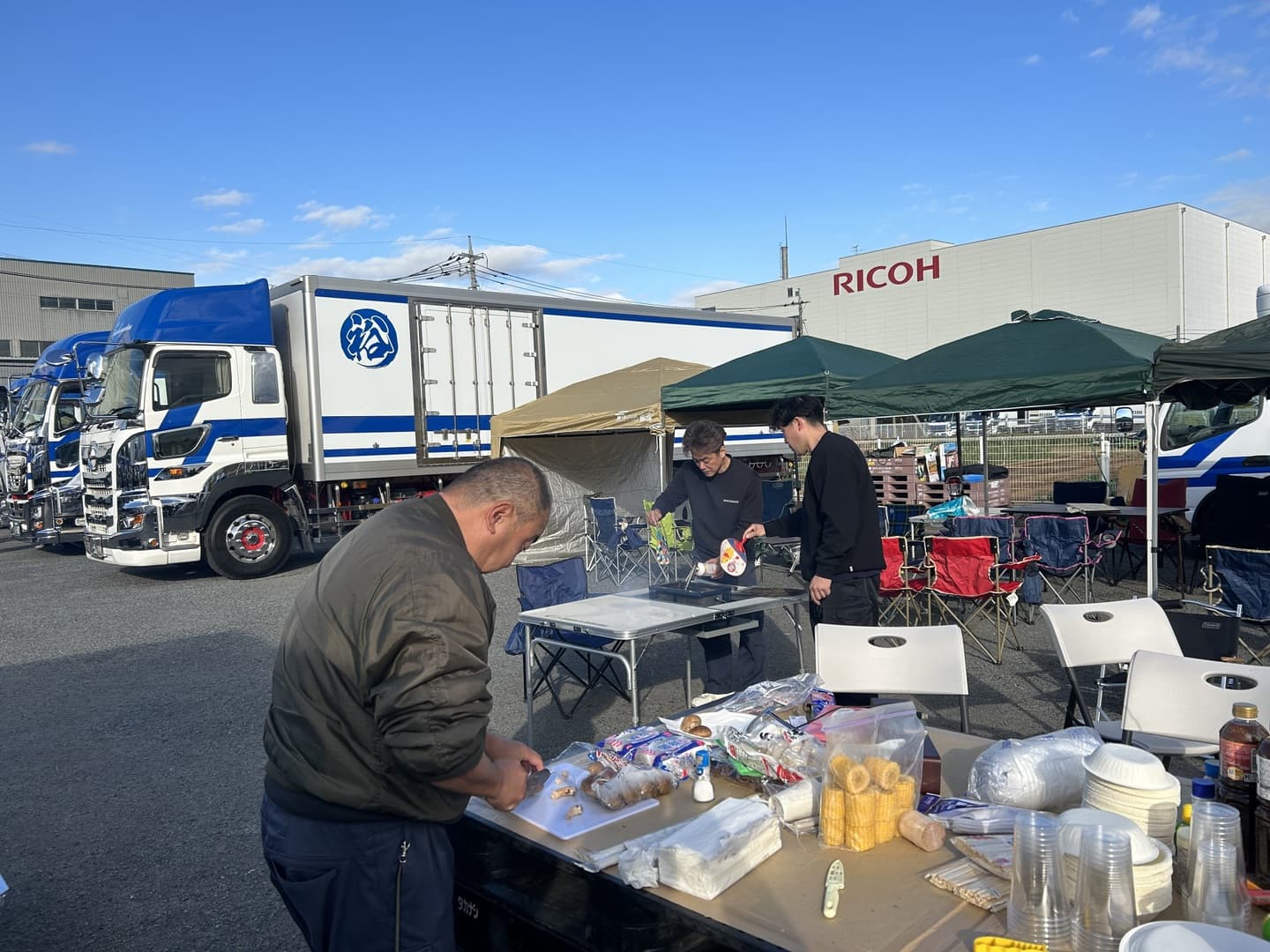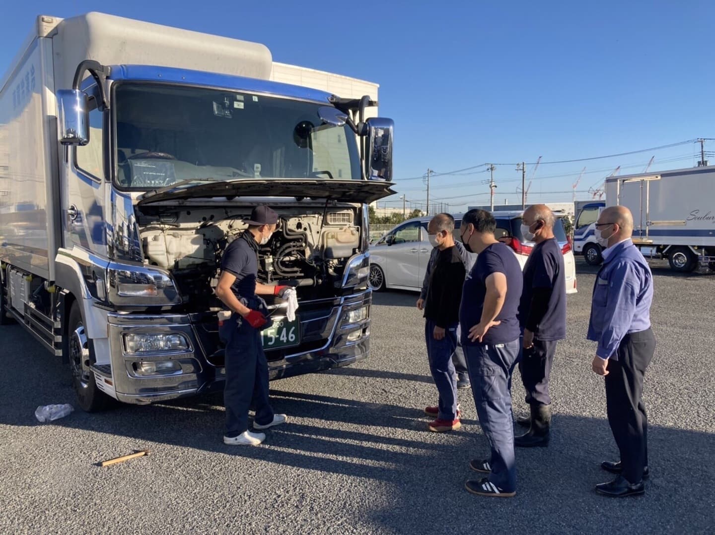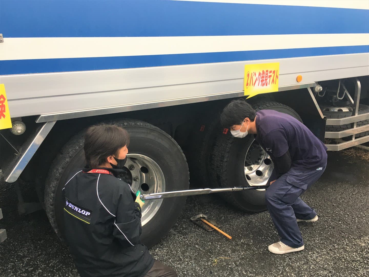 | 2022-11-26 | タイヤメーカー様にご協力頂き、タイヤ日常点検講習会を実施しました。 ナットの緩みや空気圧減圧状態などを再現して頂きました。参加者が見て触れて点検確認することが出来、良い経験になりました。タイヤメーカー様、ご協力ありがとうございました!