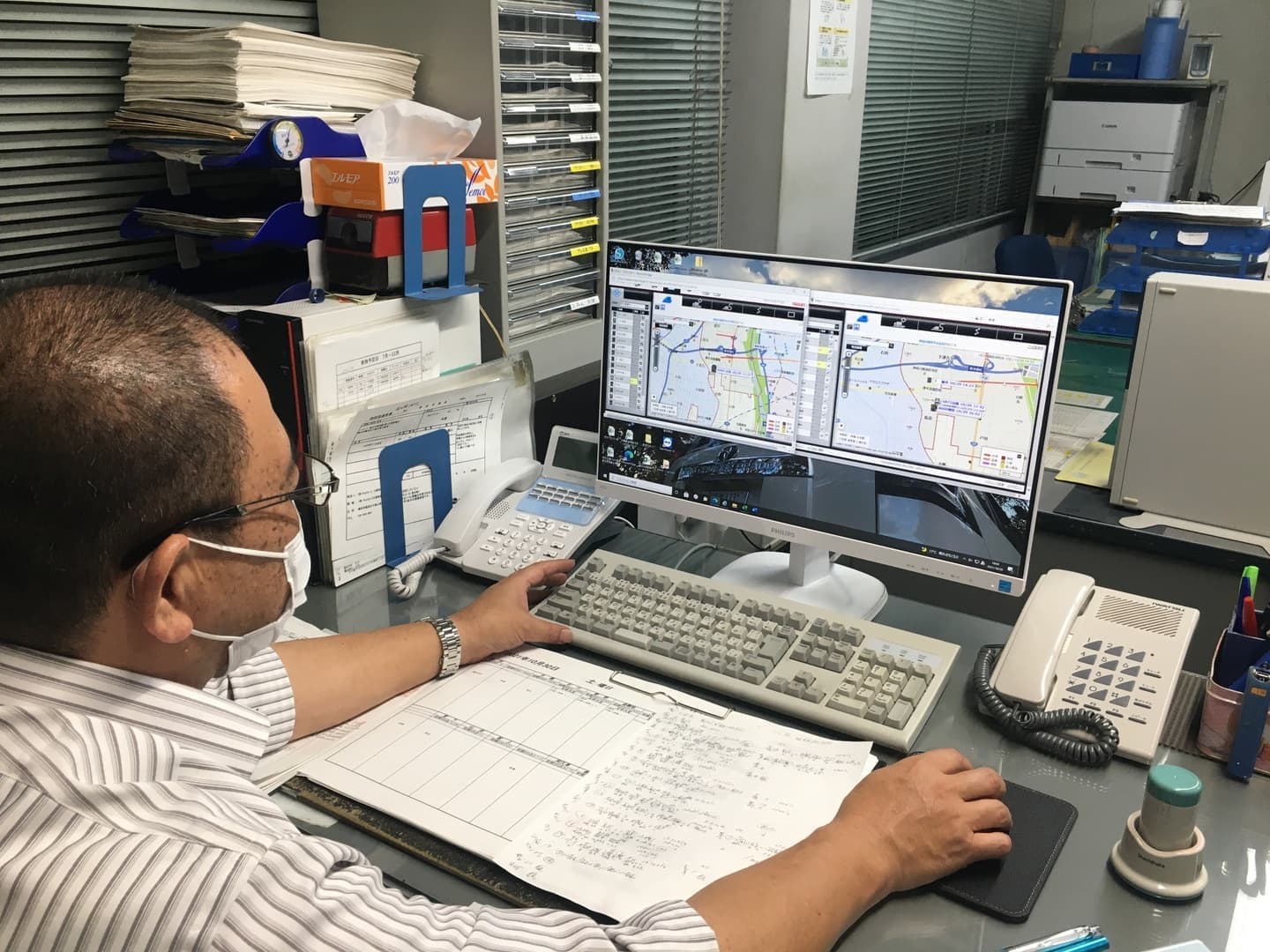 当社では、デジタルタコグラフによる安全運転管理はもちろん、燃料費の大幅な削減を目指し、環境に優しい運転と「必要最小限のアイドリングの徹底」「急発進・急停止の回避」を指導徹底し、CO2の排出を抑制するとともに地球に優しいエコドライブの促進に努めています。また、「車両位置お知らせサービス」を活用し、リアルタイムに車両位置情報・気象情報・渋滞情報を確認し、効率的な安全運行を可能にしています。