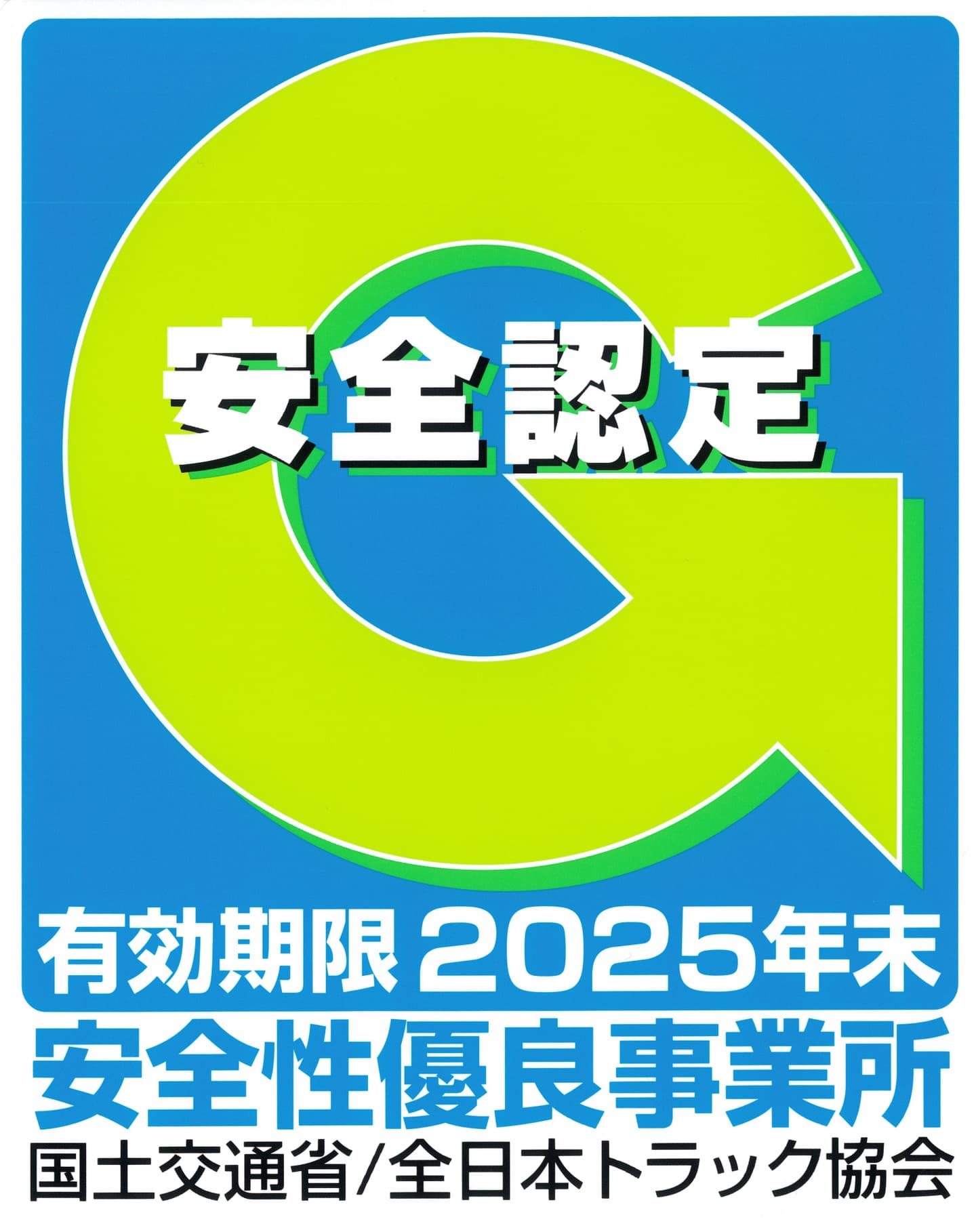 当社では、社会法人全日本トラック協会により、トラック運送事業者の交通安全対策などへの取り組みを評価され、一定の基準をクリアした事業所である「安全性優良事業所」(Gマーク)として、2018年1月に認定されました。
