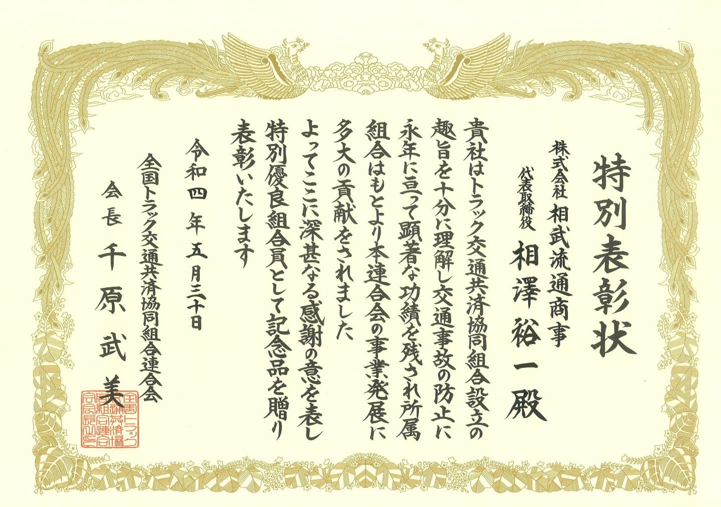 | 2022-05-30 | 全国トラック交通共済協同組合連合会会長特別表彰を頂きました! 日々の安全輸送への取り組みが評価されました!!