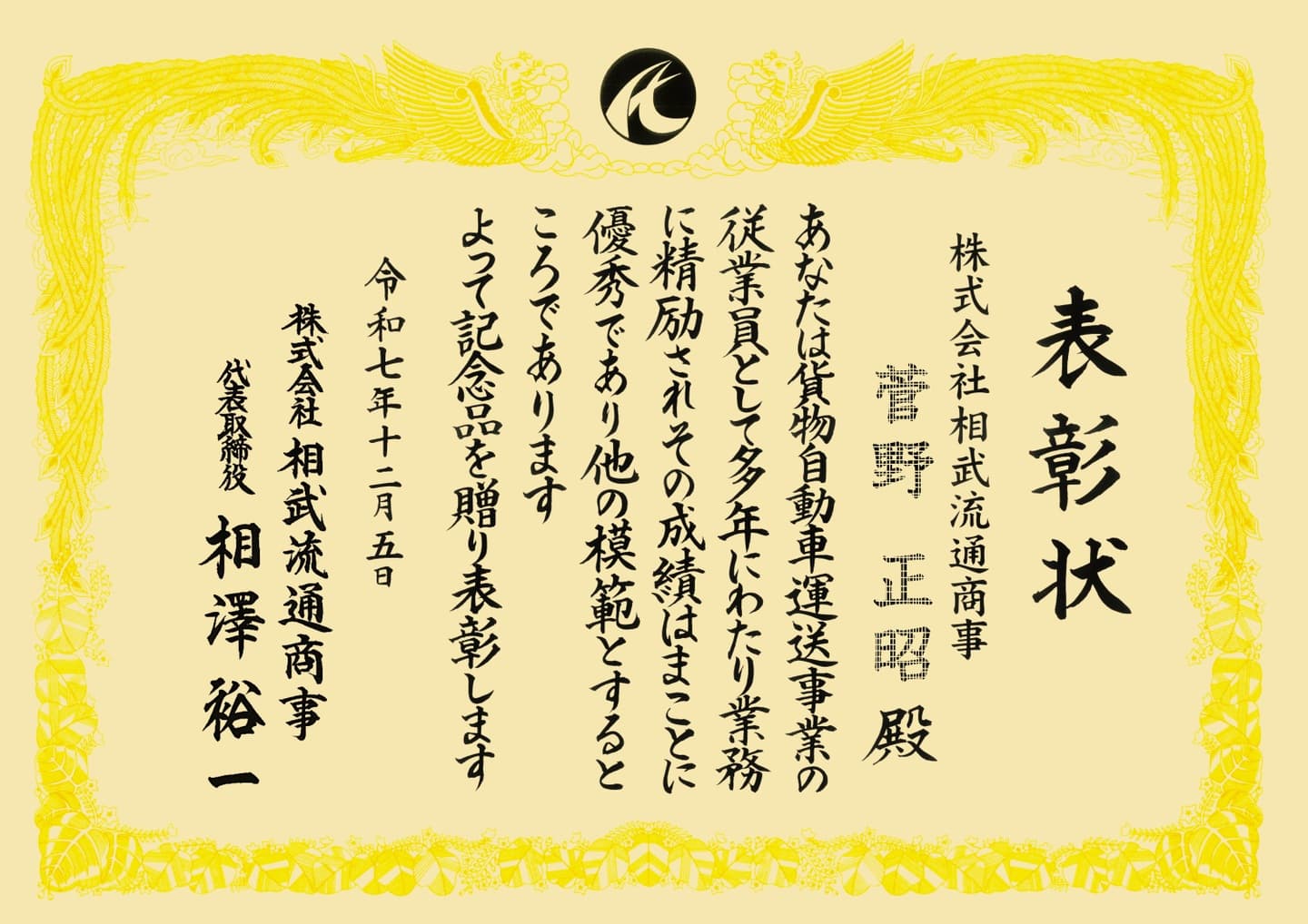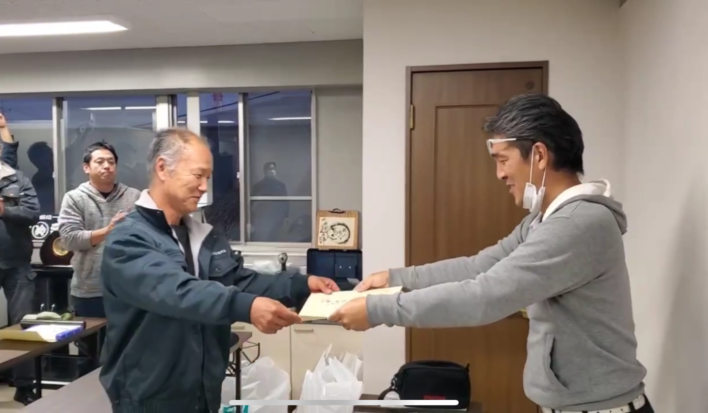| 2025-12-5 | 永年勤続表彰、今回は勤続40年 1名・10年表彰 1名の表彰を行いました。経験豊富なドライバーが多い中、40年は凄いですね!健康に気を付けて、引き続き安全輸送よろしくお願いします!